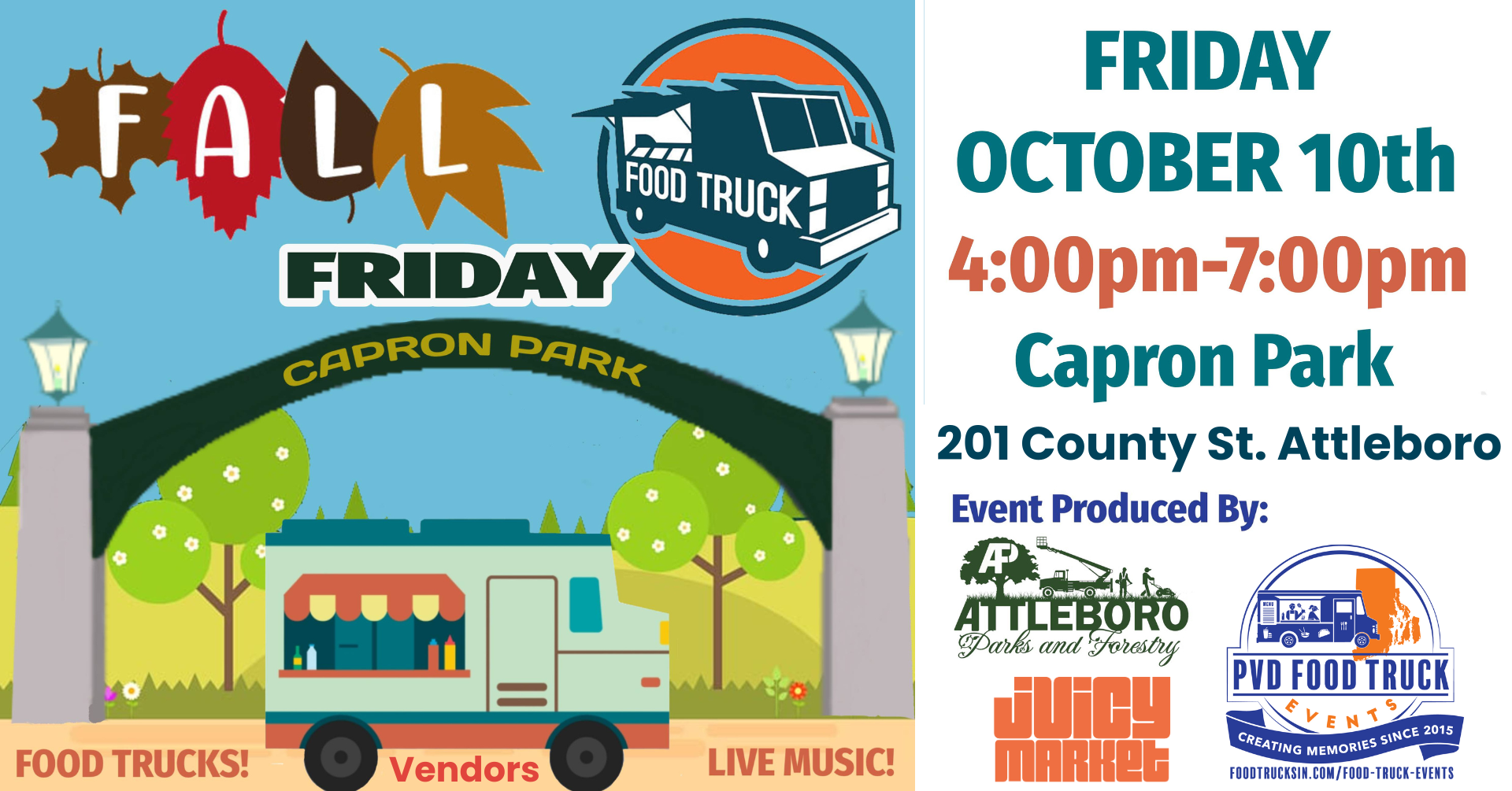 Capron Park will host one more food truck picnic in the park. Join us for our only Friday visit to Attleboro for a Fall Food Truck Friday.