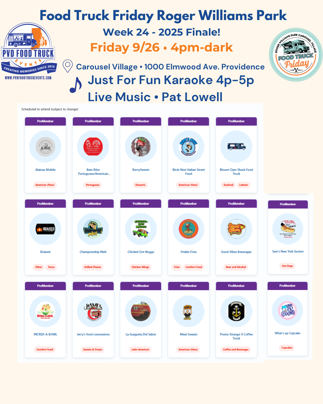 Join us for the final Food Truck Friday of 2025 at Roger Williams Park—our flagship event wrapping up its 11th season. We’re ending the year with something special and new: the fun kicks off at 4pm with Karaoke! Don’t miss it!