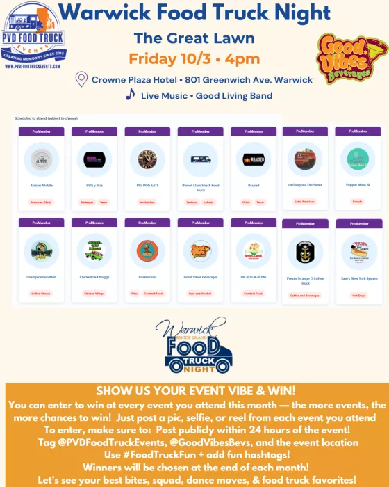 We organize a variety of events across Rhode Island and the region, most offer free admission with no ticket requirements. We will occasionally host a 21+ or ticketed event. Indulge in delicious cuisine from our selection of locally owned food trucks. Many of our events also feature live music and, where permitted, beer and wine. Whether you're hosting a private event and want a food truck parked in your driveway, planning an employee lunch or appreciation day at your workplace, or organizing any other event, we can help you find the perfect food trucks to cater to your needs.