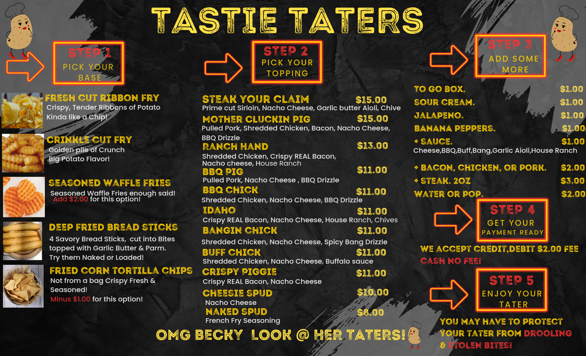 We offer Fresh cut Ribbon fries, Seasoned Waffle fries, Crispy Crinkle cut fries, Fresh fried corn chips, & Deep fried bread sticks bites, topped with delicious gourmet toppings! Everything from prime sirloin steak bites to REAL crispy bacon! House made Ranch & House made Garlic Butter Aioli! I'm sure we have something for everyone! Website go to tastie-taters.my.canva.site/