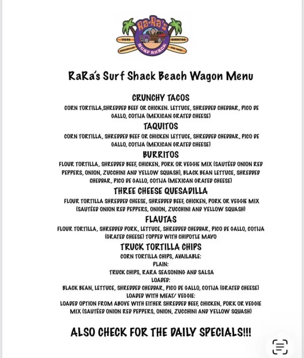 Opportunity to own a fully operational taco truck and established brand. RaRa’s Surf Shack is a surf-themed taco truck concept with recognizable branding, custom artwork, proven recipes, and existing event contacts.